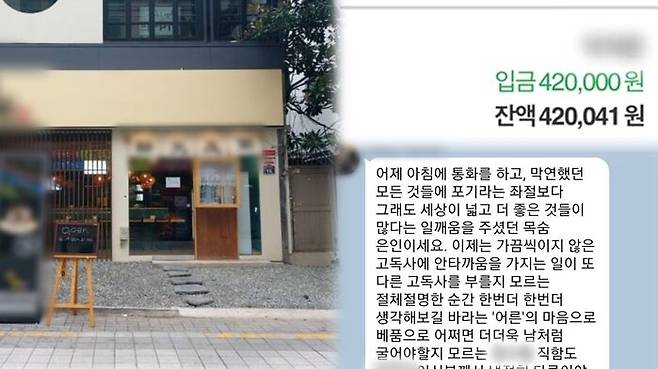 하지만, 당장 식자재 대금도 낼 돈이 없어 극단적인 생각마저 했던 30살 사장님에게 이분이 쥐여 준 42만 원은, 아마 4천만 원보다 많은, 아니 생명을 구한 큰 값어치가 있는 행동이라 생각해 이렇게 소개하기로 마음먹었습니다. 대신 그 직원분 신상이 드러나지 않도록 최대한 익명으로 소개할 수밖에 없었습니다.