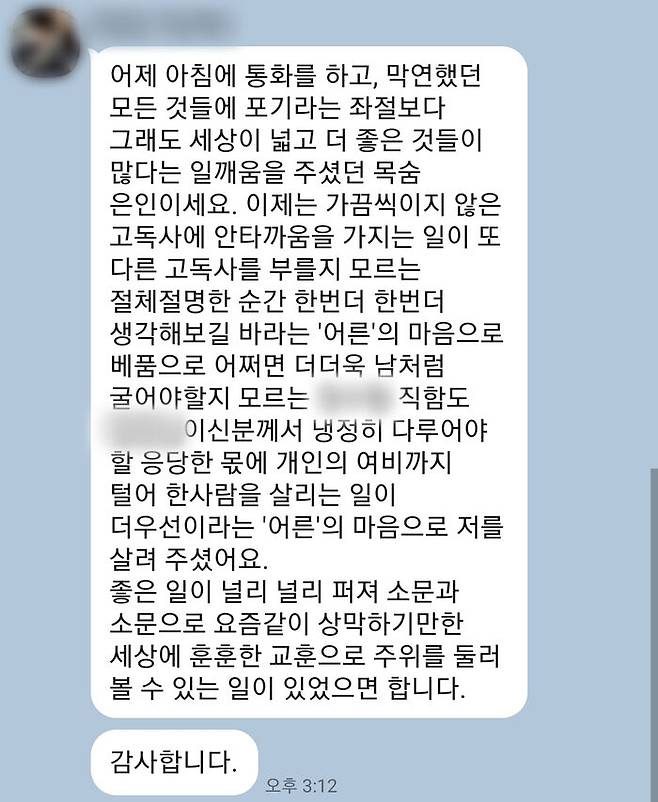 '더는 살고 싶지가 않다'는 하늘 씨에게 그 직원은 도리어 '젊은 사람이 살아야지, 왜 그런 생각을 하냐'며 울컥했습니다.