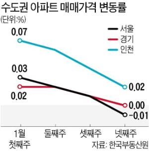 한국부동산원이 27일 발표한 1월 넷째주 주간 아파트가격 동향에 따르면 이번주(24일 기준) 서울 아파트 매매가격지수는 전주 대비 0.01% 하락했다. 지난달 첫째주(0.10%) 이후 7주 연속 상승세가 둔화하다가 이번주에는 마이너스로 돌아섰다.