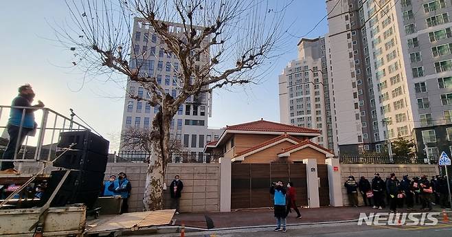 [청주=뉴시스] 안성수 기자 = 27일 오후 청주대 민주적 발전을 위한 공동대책위원회가 노사 갈등의 중심인물로 지목한 김윤배 전 총장의 사택 앞에서 상여가두시위를 벌인 뒤 임금·단체협약을 이행을 촉구하고 있다. 2022.01.27. hugahn@newsis.com