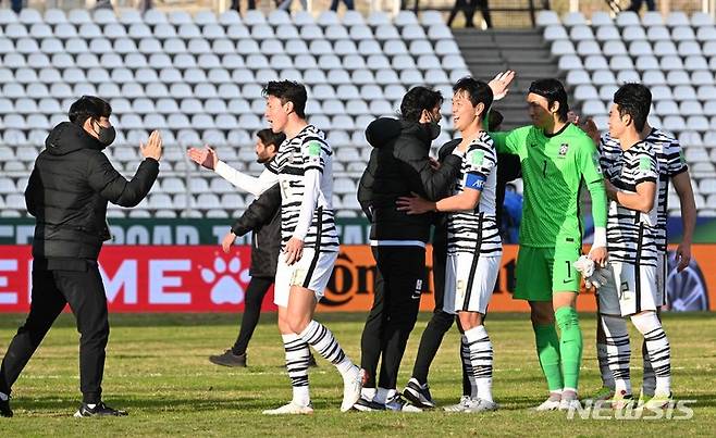 [시돈(레바논)=뉴시스] 배훈식 기자 = 2022 카타르 월드컵 아시아 지역 최종예선 대한민국과 레바논과의 경기가 열린 27일 오후 레바논 시돈 사이다 무니시팔 경기장에서 1대 0 승리를 거둔 선수들이 기뻐하고 있다. 2022.01.27. dahora83@newsis.com