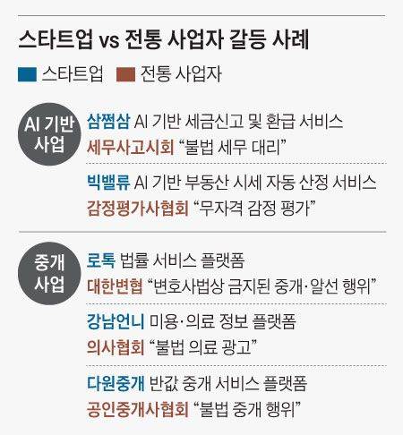 첨단 신기술로 무장한 스타트업이 세무·부동산 등 각종 전통 사업 분야로 영역을 확대하면서 스타트업과 기존 사업자 간 갈등이 격화하고 있다. 이전까지 갈등의 핵심이 ‘왜 스타트업이 중간에 끼어서 업체 소개·광고 수수료를 받으며 시장 질서를 해치느냐’였다면, 최근에는 ‘인공지능(AI)이 전통 사업자의 역할을 대신하는 것은 위법인가 아닌가’라는 논란까지 등장했다. 스타트업 업계에선 “기존 사업자들이 자신들의 기득권을 지키기 위해 혁신을 막고 있다”고 주장하는 반면, 각종 직능 단체들은 “스타트업들의 무자격 중개는 결국 소비자 피해로 돌아갈 것”이라며 반발한다.