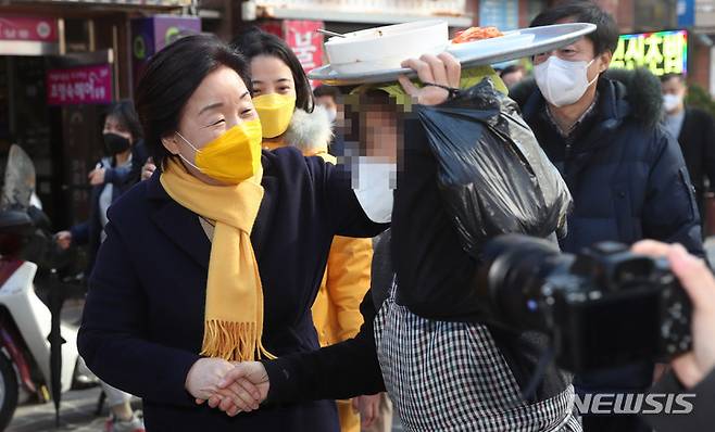 [부산=뉴시스] 하경민 기자 = 심상정 정의당 대선 후보가 28일 부산 부산진구 부전시장을 방문, 시민과 상인에게 명절 인사를 하고 있다. 2022.01.28. yulnetphoto@newsis.com