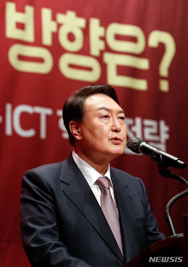 [서울=뉴시스] 국회사진기자단 = 윤석열 국민의힘 대선 후보가 28일 서울 마포구 누리꿈스퀘어에서 열린 '차기 대통령의 디지털혁신 방향은?' 벤처·ICT 혁신 전략 토론회에서 인사말하고 있다. 2022.01.28. photo@newsis.com
