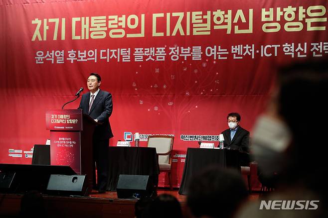 [서울=뉴시스] 국회사진기자단 = 윤석열 국민의힘 대선 후보가 28일 서울 마포구 누리꿈스퀘어에서 열린 '차기 대통령의 디지털혁신 방향은?' 벤처·ICT 혁신 전략 토론회에서 인사말하고 있다. 2022.01.28. photo@newsis.com