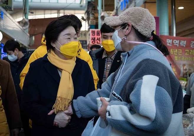 [서울=뉴시스] 김선웅 기자 = 심상정 정의당 대선 후보가 28일 부산 부전시장에서 설명절을 맞아 시민들과 인사를 나누고 있다. (사진=정의당 제공) 2022.01.28. photo@newsis.com *재판매 및 DB 금지