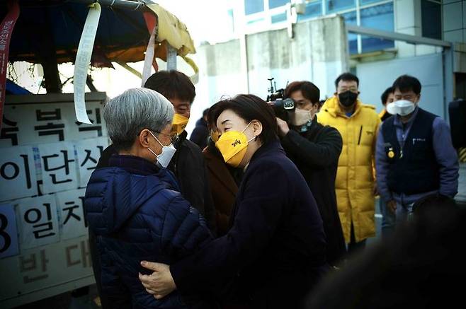 [서울=뉴시스] 김선웅 기자 = 심상정 정의당 대선 후보가 28일 부산 영도구 태종로 HJ중공업 정문 앞 천막농성장에서 한진중공업 해고자 김진숙 지도위원과 만남을 갖고 있다. (사진=정의당 제공) 2022.01.28. photo@newsis.com