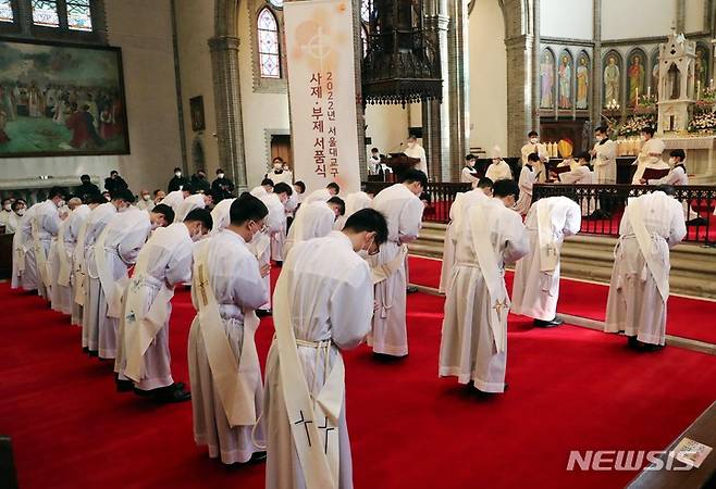 [서울=뉴시스] 사진공동취재단 = 28일 서울 중구 명동성당에서 천주교 서울대교구 사제 서품식이 열리고 있다. 2022.01.28. photo@newsis.com