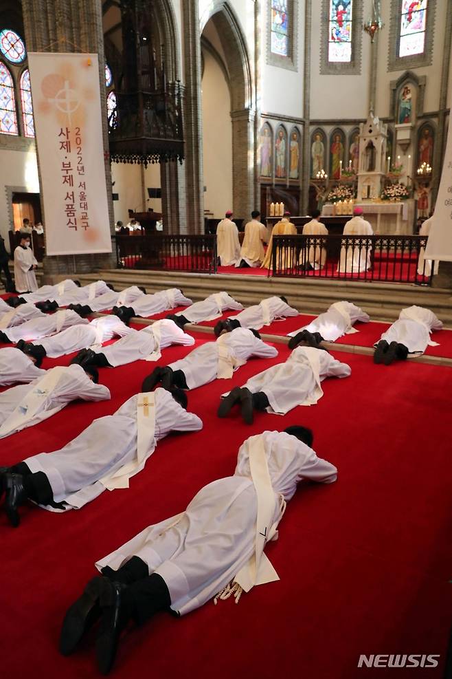 [서울=뉴시스] 사진공동취재단 = 28일 서울 중구 명동성당에서 열린 천주교 서울대교구 사제 서품식에서 사제 수품 후보자들이 세상에 죽고 하느님께 봉사하겠다는 것을 드러내기 위해 부복하고 있다. 2022.01.28. photo@newsis.com