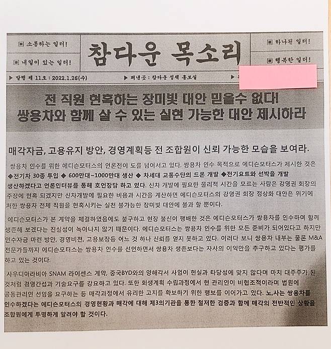 쌍용차 사내 노동자 모임 '참다운 목소리' 역시 최근 선전물을 통해 "에디슨이 사우디 SNAM 라이선스 계약, 중국 BYD 양해각서 등이 현실과 맞지 않다며 마치 대주주가 된 것처럼 경영 간섭과 기술 요구 강요를 하고 있다"고 지적했다. 이들은 "본계약 체결 후에도 현장에서 불신이 팽배한 것은 에디슨의 진실성이 녹아나지 않기 때문"이라며 "에디슨은 쌍용차 인수를 위한 모든 준비가 돼있다고 하지만 인수자금 마련방안, 경영 비전, 고용 보장 등 어느 것 하나 신뢰를 얻지 못하고 있다"고 지적했다.