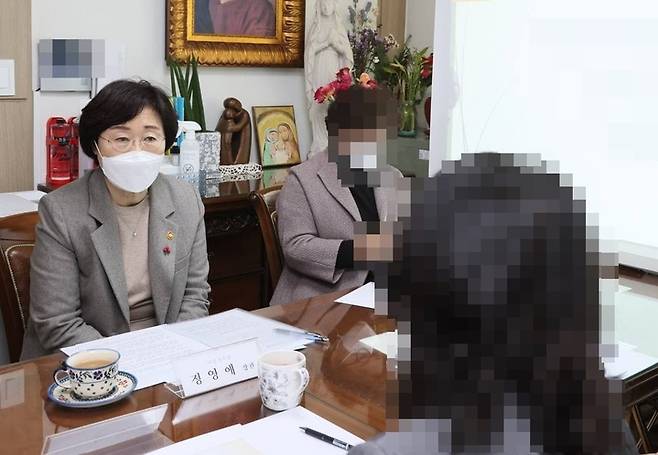 [서울=뉴시스] 고승민 기자 = 정영애 여성가족부 장관이 28일 서울 소재 가정폭력 피해자 보호시설을 찾아 방역 상황 점검 및 시설 종사자, 피해자들과 대화를 나누고 있다. (사진=여성가족부 제공) 2022.01.28. photo@newsis.com *재판매 및 DB 금지