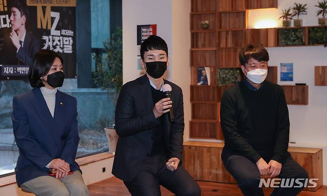 [서울=뉴시스] 국회사진기자단 = 28일 서울 여의도 한 카페에서 열린 'MZ세대라는 거짓말' 북 콘서트에서 저자인 박민영 국민의힘 청년보좌역이 인사말하고 있다. 2022.01.28. photo@newsis.com