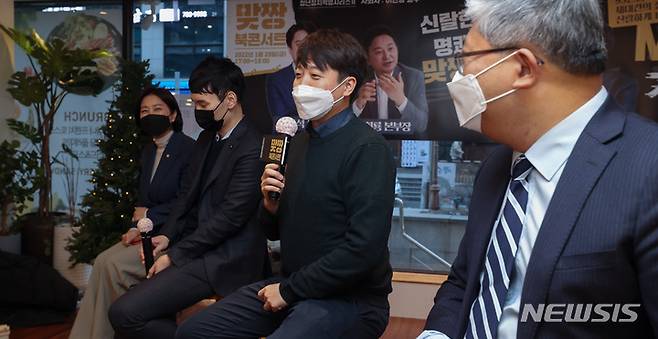 [서울=뉴시스] 국회사진기자단 = 이준석 국민의힘 대표가 28일 서울 여의도 한 카페에서 열린 'MZ세대라는 거짓말' 북 콘서트에서 축사하고 있다. 2022.01.28. photo@newsis.com