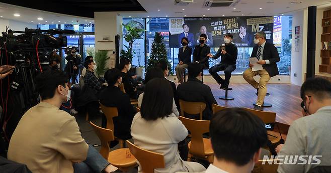 [서울=뉴시스] 국회사진기자단 = 이준석 국민의힘 대표가 28일 서울 여의도 한 카페에서 열린 'MZ세대라는 거짓말' 북 콘서트에서 축사하고 있다. 2022.01.28. photo@newsis.com