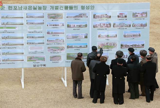 [서울=뉴시스] 조선중앙TV는 28일 김정은 조선노동당 총비서 겸 국무위원장이 대규모 채소 온실농장이 들어설 함경 함주군 연포지구 건설 예정지를 시찰했다고 보도했다. (사진=조선중앙TV 캡처) 2022.01.28. photo@newsis.com *재판매 및 DB 금지