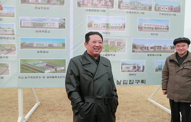 [서울=뉴시스] 조선중앙TV는 28일 김정은 조선노동당 총비서 겸 국무위원장이 대규모 채소 온실농장이 들어설 함경 함주군 연포지구 건설 예정지를 시찰했다고 보도했다. (사진=조선중앙TV 캡처) 2022.01.28. photo@newsis.com *재판매 및 DB 금지