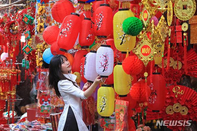 [하노이=AP/뉴시스] 28일(현지시간) 베트남 하노이 구시가지에서 한 여성이 전통 설 '뗏'(Tet)을 앞두고 전통 시장을 찾아 장식용 랜턴을 고르고 있다. 2022.01.28.