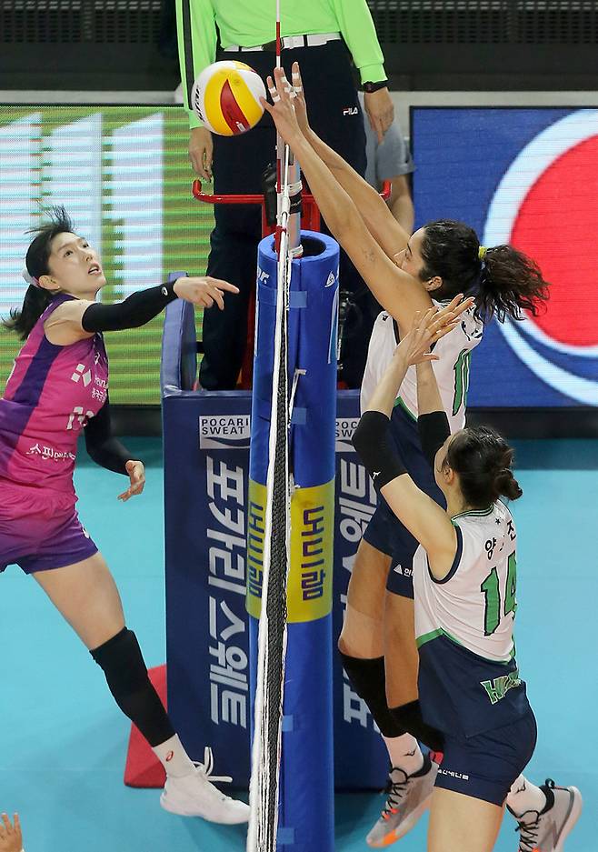 [서울=뉴시스] 고승민 기자 = 28일 인천삼산월드체육관에서 열린 2021-2022 V리그 현대건설 대 흥국생명 경기, 현대건설 야스민이 블로킹하고 있다. (사진=현대건설 배구단 제공) 2022.01.28. photo@newsis.com *재판매 및 DB 금지