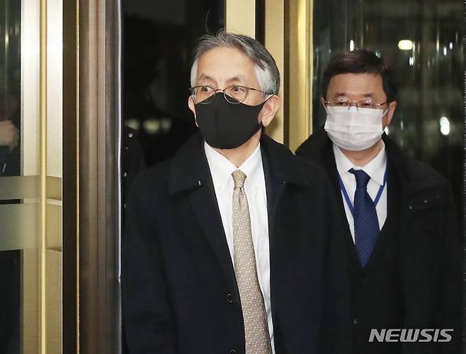 [서울=뉴시스] 김명원 기자 = 일본 정부가 일제강점기 조선인 징용 현장인 사도광산의 유네스코 세계문화유산 등재 추천을 강행한 28일 서울 종로구 외교부 청사로 아이보시 고이치 주한일본대사가 초치되고 있다. 과거 일본 최대 금 광산 중 하나였던 일본 니가타현에 소재한 사도광산은 일제강점기 당시 '군함도(하시마 탄광)'와 함께 조선인 강제 징용 현장 중 하나기도 했다. 태평양 전쟁 시기 1000~2000명의 조선인이 사도 금광에서 노역한 것으로 추정된다. 군함도는 앞서 2020년 6월 유네스코 세계문화유산으로 등재됐다. (공동취재사진) 2022.01.28. photo@newsis.com