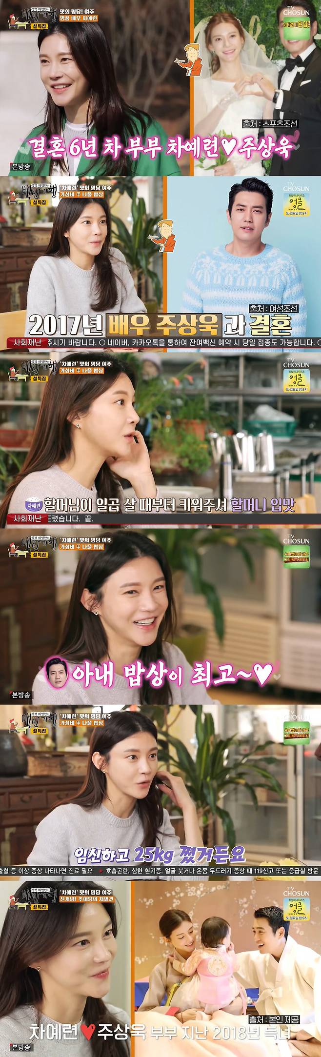 평소 나물을 좋아한다는 차예련은 이날 나물 밥상이 나오자 폭풍 흡입했다. 그는 "임신했을 때는 고추장에 달걀 프라이 비벼서 두 그릇씩 먹고 그랬다. 3인분씩 먹었다"며 "임신하고 25kg 쪘다. 근데 너무 행복했다. 사실 지금은 매일 다이어트 하는 느낌이다"라고 밝혔다. 이어 "근데 남편도 10kg나 쪘다. 같이 먹어야 되니까"라며 먹덧도 함께할 정도로 좋은 금슬을 자랑했다.