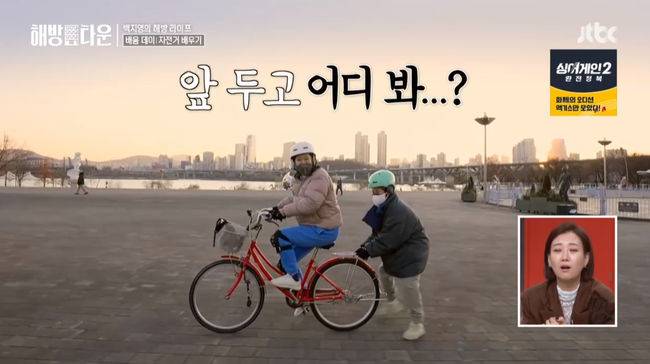 이에 김신영은 "하체 운동을 하자"라며 하체 운동을 시작했다. 백지영은 다시 힘을 내서 도전했다. 김신영은 뒤에서 백지영의 자전거를 잡고 다시 연습을 시작했다. 하지만 이내 김신영은 백지영의 자전거를 놨고 백지영은 놓은 줄도 모르고 페달을 굴려 자전거 타기에 성공했다.
