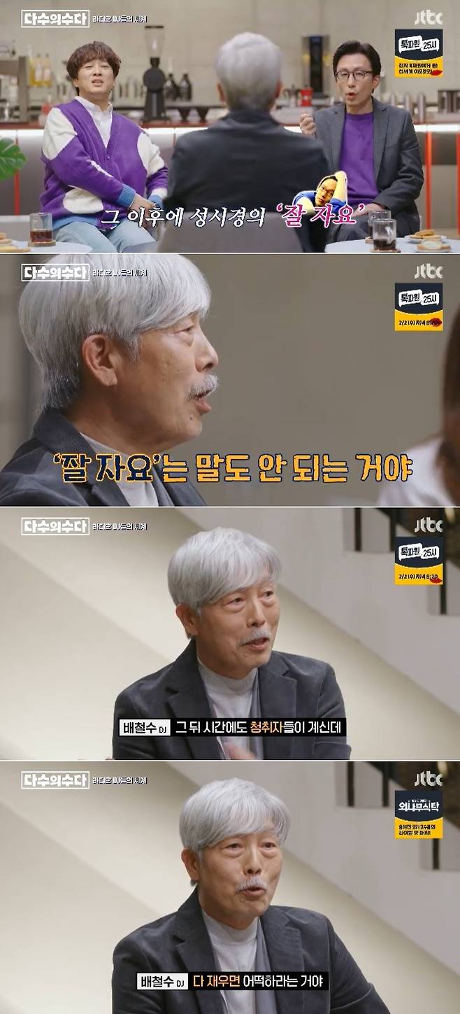 그러면서, 성시경이 심야 라디오 '푸른밤 그리고 성시경입니다'를 진행할 때 했던 메가 히트 시그니처 멘트 '잘자요'에 대한 이야기가 나왔고, 배철수는 "성시경한테도 이야기 한 것"이라며 "뒤에도 듣는 분들이 계신데 '잘자요'는 말도 안 되는 거다. 다 재우면 어쩌냐"고 말해 이목을 사로잡았다.(사진=JTBC '다수의 수다' 방송 캡처)