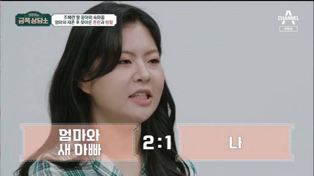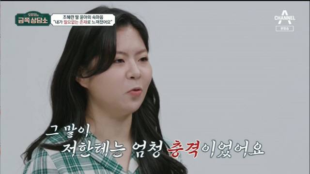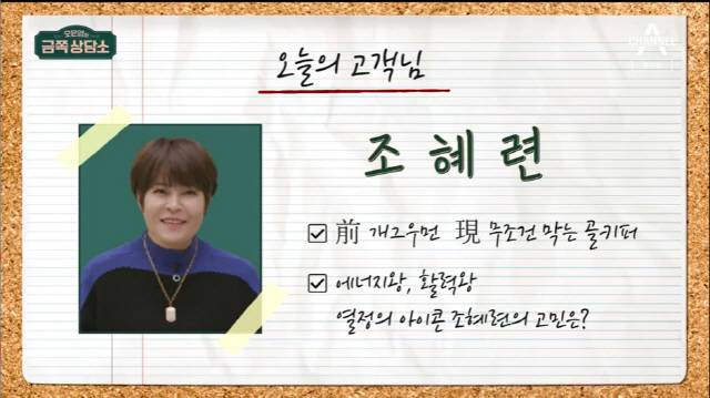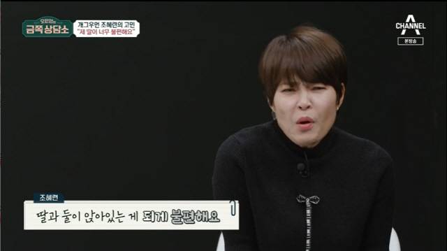 조혜련은 그제서야 어디에서도 말하지 못했던 고민을 털어놓았다. 그는 "딸이 갑이고 제가 을이다"라고 말문을 열었다. 공부 잘하고 똑부러지는 조혜련의 딸 윤아, 하지만 두 사람은 어딘가 어색해보였다. 조혜련은 "제가 딸 눈치를 보는 것 같다. 딸이 딸 같지 않다. 연예인 동료 같다. 둘이 앉아 있는 게 불편하다. 내 마음대로 통화도 못한다. 물어보진 않았지만 딸도 불편해 하는 것 같다"라고 털어놓았다.