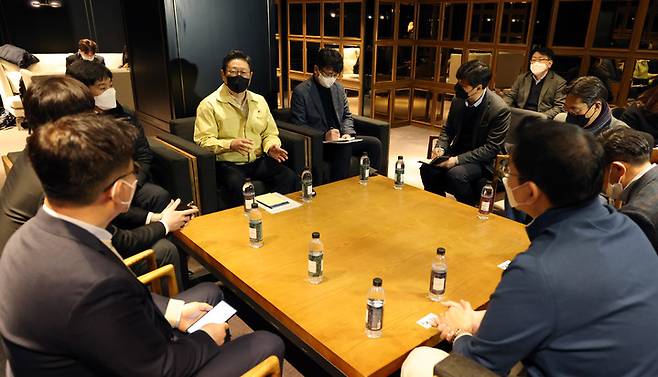 [서울=뉴시스] 조수정 기자 = 황희 문화체육관광부 장관이 29일 설 연휴를 맞아 서울 용산구 CGV용산아이파크몰을 찾아 코로나19 방역 현장점검을 한 뒤 업계 대표들을 만나 현장 애로사항을 청취하고 의견을 나누고 있다. (사진=문화체육관광부 제공) 2022.01.29. chocrystal@newsis.com *재판매 및 DB 금지