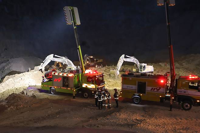 [양주=뉴시스] 조수정 기자 = 중대재해처벌법 시행 이틀째인 29일 경기 양주시 은현면 도하리 삼표산업 양주사업소 석재채취장에서 발생한 토사 붕괴사고 현장에서 소방 구조대원 등이 실종자를 찾기 위해 야간 수색을 하고 있다. 이날 오전 10시 8분께 골재채취 작업 중 토사가 무너져내리며 작업자 3명이 매몰됐고 그 중 두명을 구조했으나 사망했다. (사진=경기북부소방재난본부 제공)2022.01.29. chocrystal@newsis.com