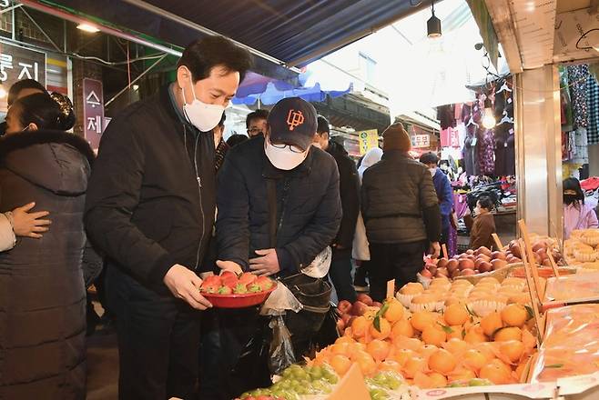 설 연휴 첫날, 전통시장 찾은 오세훈 서울시장