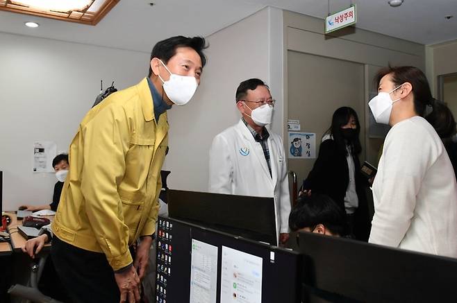 [서울=뉴시스] 조수정 기자 = 오세훈 서울시장이 설 연휴 첫날인 29일 오후 구로구 미소들병원을 찾아 오미크론 대비 코로나19 외래진료센터 운영현황 확인 및 근무자를 격려하고 있다. (사진=서울시 제공) 2022.01.29. photo@newsis.com *재판매 및 DB 금지