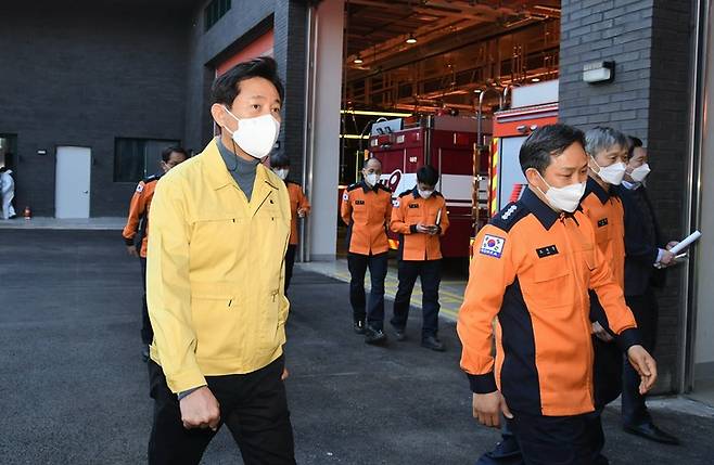 [서울=뉴시스] 조수정 기자 = 오세훈 서울시장이 설 연휴 첫날인 29일 오후 서울 금천소방서를 찾아 오미크론 대응 응급출동 체계 점검 및 근무자를 격려하고 있다. (사진=서울시 제공) 2022.01.29. photo@newsis.com *재판매 및 DB 금지