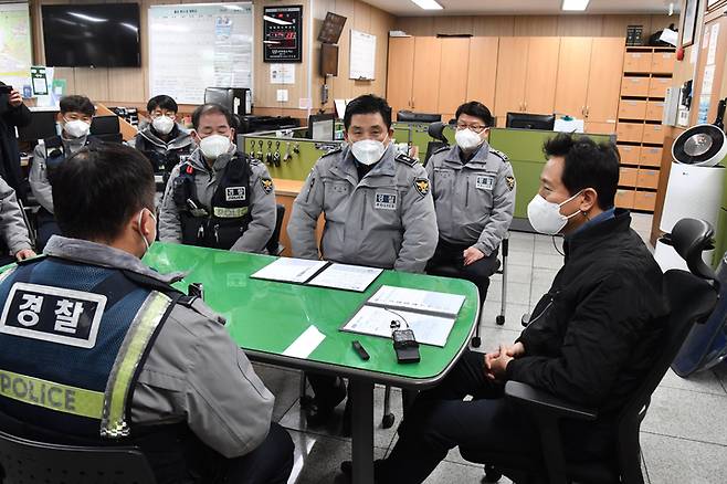 [서울=뉴시스] 조수정 기자 = 오세훈 서울시장이 설 연휴 첫날인 29일 오후 서울 금천파출소를 찾아 연휴기간 시민안전 대비 당부 및 경찰 근무자들을 격려하고 있다. (사진=서울시 제공) 2022.01.29. photo@newsis.com *재판매 및 DB 금지