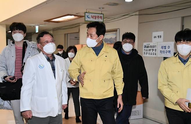[서울=뉴시스] 조수정 기자 = 오세훈 서울시장이 설 연휴 첫날인 29일 오후 구로구 미소들병원을 찾아 오미크론 대비 코로나19 외래진료센터 운영현황 확인 및 근무자를 격려하고 있다. (사진=서울시 제공) 2022.01.29. photo@newsis.com *재판매 및 DB 금지