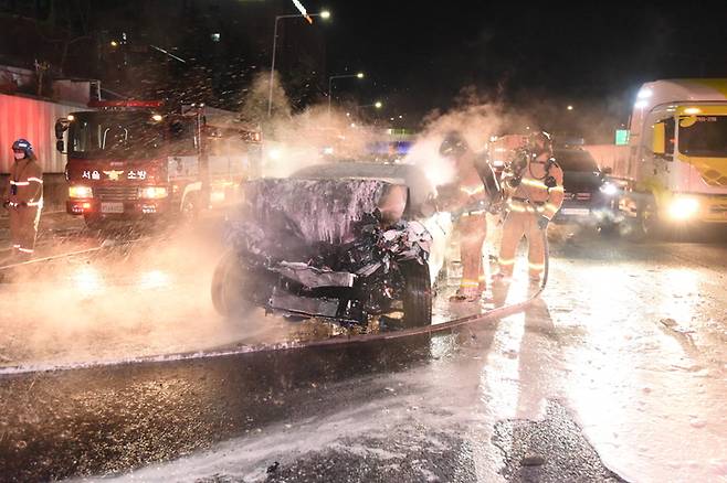 [서울=뉴시스] 조수정 기자 = 설 연휴 첫날인 29일 새벽 3시 42분께 경인고속도로 서울 신월IC 부근 700m 전 인천에서 서울방향으로 주행하던 승용차가 앞서가던 덤프트럭 후미를 충돌하며 화재가 발생, 소방대원들이 진화하고 있다. 화재는 오전 4시 20분께 완진됐다. (사진=양천소방서 제공) 2022.01.29. photo@newsis.com
