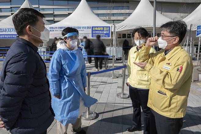 [서울=뉴시스] 조수정 기자 = 류근혁 보건복지부 제2차관(코로나바이러스감염증-19 중앙재난안전대책본부 제1총괄조정관)이 1월 설 연휴 첫날인 29일 오후 세종시청에 설치된 선별진료소를 방문, 검사체계 전환에 따른 준비상황을 점검하고 있다. 29일부터 일반 국민들은 선별진료소를 방문하는 경우 자가검사키트를 배부받을 수 있다. 정부는 2월 3일부터 고위험군은 현장에서 바로 유전자증폭(이하 PCR) 검사를 실시하고, 저위험군은 자가검사키트 현장 검사를 거쳐, 양성인 경우 PCR 검사를 진행하는 것으로 선별진료소 검사체계를 변경했다. (사진=보건복지부 제공) 2022.01.29. photo@newsis.com *재판매 및 DB 금지