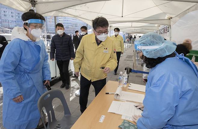 [서울=뉴시스] 조수정 기자 = 류근혁 보건복지부 제2차관(코로나바이러스감염증-19 중앙재난안전대책본부 제1총괄조정관)이 1월 설 연휴 첫날인 29일 오후 세종시청에 설치된 선별진료소를 방문, 검사체계 전환에 따른 준비상황을 점검하고 있다. 29일부터 일반 국민들은 선별진료소를 방문하는 경우 자가검사키트를 배부받을 수 있다. 정부는 2월 3일부터 고위험군은 현장에서 바로 유전자증폭(이하 PCR) 검사를 실시하고, 저위험군은 자가검사키트 현장 검사를 거쳐, 양성인 경우 PCR 검사를 진행하는 것으로 선별진료소 검사체계를 변경했다. (사진=보건복지부 제공) 2022.01.29. photo@newsis.com *재판매 및 DB 금지
