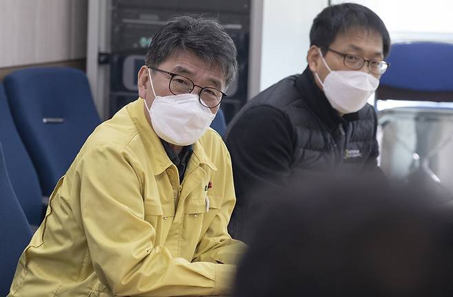 [서울=뉴시스] 조수정 기자 = 류근혁 보건복지부 제2차관(코로나바이러스감염증-19 중앙재난안전대책본부 제1총괄조정관)이 1월 설 연휴 첫날인 29일 오후 세종시청에 설치된 선별진료소를 방문, 검사체계 전환에 따른 준비상황을 점검, 간담회 하고 있다. 29일부터 일반 국민들은 선별진료소를 방문하는 경우 자가검사키트를 배부받을 수 있다. 정부는 2월 3일부터 고위험군은 현장에서 바로 유전자증폭(이하 PCR) 검사를 실시하고, 저위험군은 자가검사키트 현장 검사를 거쳐, 양성인 경우 PCR 검사를 진행하는 것으로 선별진료소 검사체계를 변경했다. (사진=보건복지부 제공) 2022.01.29. photo@newsis.com *재판매 및 DB 금지