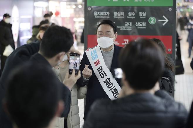 [서울=뉴시스] 전신 기자 = 윤석열 국민의힘 대선 후보가 설 연휴 첫날인 29일 서울 강남역을 찾아 시민들과 인사하며 기념촬영하고 있다. (사진=국민의힘 선대본 제공) 2022.01.29. photo@newsis.com *재판매 및 DB 금지