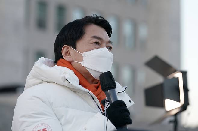 [서울=뉴시스] 전신 기자 = 안철수 국민의당 대선 후보가 30일 서울 여의도 국회 본관 앞에서 양자 담합 토론 규탄 철야농성에 앞서 발언하고 있다. (사진=국민의당 제공) 2022.01.30. photo@newsis.com *재판매 및 DB 금지