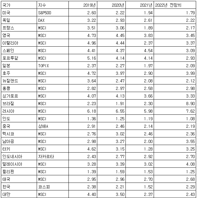 한국 배당 수익률을 보면 2019년 2.38%, 2020년 2.21%, 2021년 1.52% 등으로 해마다 떨어졌다.