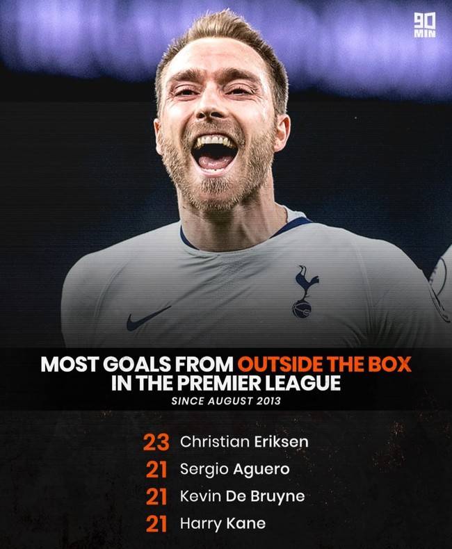 영국 '90min'은 "에릭센이 자신의 기록을 그대로 가진 채 EPL로 돌아왔다"라면서 2013년 여름 이후 선수들의 페널티 박스 밖에서의 득점 기록을 공개했다.
