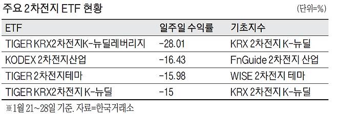2일 한국거래소에 따르면 지난달 21일부터 28일 사이 가장 낙폭이 두드러진 ETF는 2차전지 관련 상품이었다. 일주일 새 가장 많이 떨어진 ETF는 'TIGER KRX2차전지K-뉴딜레버리지'로 손실률이 28.01%에 이른다. 레버리지형을 제외한 ETF 중에서는 'KODEX 2차전지산업'이 16.43% 하락해 수익률이 가장 안 좋았다. 'TIGER 2차전지테마'도 15.98% 손실률을 기록했다.