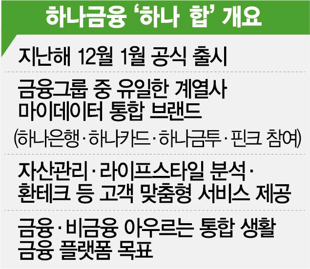 하나금융은 지난해 12월 마이데이터(본인신용정보관리업) 기반의 그룹사 통합 생활금융 플랫폼인 ‘하나 합’을 선보였고 이를 통해 고객들의 맞춤형 자산 관리를 강화한다는 계획이다. 하나 합은 흩어져 있는 다양한 금융자산을 한곳으로 모아(합·合) 관리한다는 의미를 담았다. ‘하나 합’을 통해 기존 소수의 고액자산가에게만 제공되던 하나은행만의 전문 자산 관리 노하우를 디지털화해 전달한다. ‘하나 합’에서는 자산을 진단하고 처방해주는 자산 관리 서비스는 물론 고객 개개인의 지출을 분석·제공하는 ‘라이프스타일 분석’ 서비스, 이루고 싶은 목표를 설정해 외환 자산을 불려주는 ‘환테크 챌린지’ 서비스 등 맞춤형 서비스를 받을 수 있다. 이 밖에도 하나금융투자·하나카드·핀크 등 각 관계사의 강점과 경험을 녹여냈다. 하나금융 관계자는 “그룹 내 마이데이터 서비스를 제공하고 각 계열사 네 곳의 특화 서비스를 공유하고 연계했다는 것이 ‘하나 합’의 특징”이라고 설명했다.