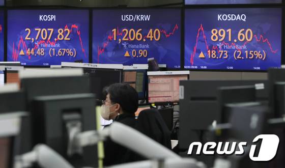 코스피시장이 외국인과 기관의 쌍끌이 매수세에 힘입어 2700선을 회복한 3일 서울 중구 하나은행 명동점 딜링룸 전광판에 코스피 지수가 전 거래일보다 44.48포인트 1.67%오른 2,707.82을 나타내고 있다.