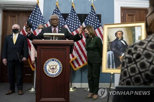 House Majority Whip James Clyburn, D-S.C., addresses reporters during a news conference to unveil the Joseph H. Rainey Room at the U.S. Capitol in Washington, Thursday, Feb. 3, 2022. Rainey born into slavery in 1832. He was elected to Congress representing South Carolina and sworn into office in 1870, becoming the first Black member of the House of Representatives. (Greg Nash/Pool via AP) POOL IMAGE