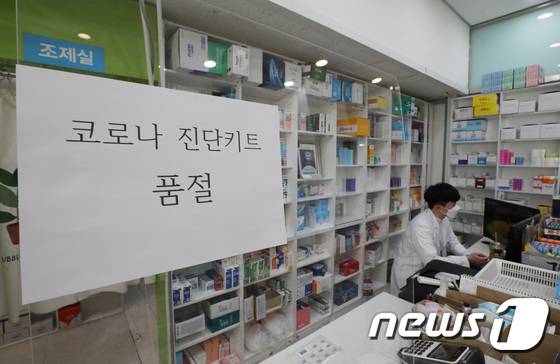 (화성=뉴스1) 김영운 기자 = 신종 코로나바이러스 감염증(코로나19) 진단검사 체계가 바뀌면서 자가검사키트 품절 사태가 발생하고 있는 가운데 4일 오전 경기도 화성시의 한 약국에 코로나19 자가검사키트 품절을 알리는 안내문이 부착돼 있다. 이날 신규 확진자는 2만7443명이 발생해 역대 최다 기록을 경신했다. 2022.2.4/뉴스1