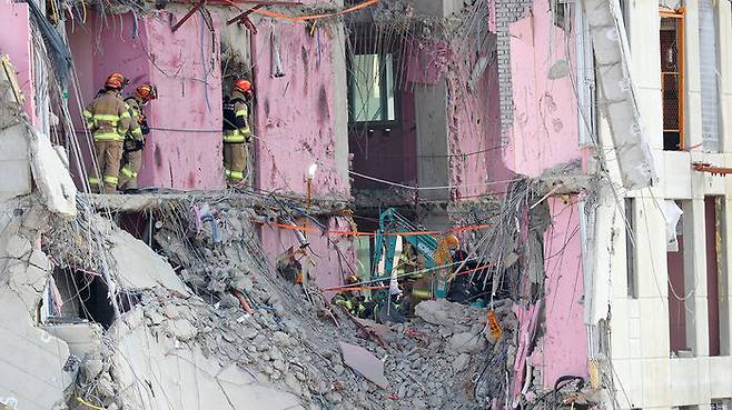 붕괴 면에 얹혔던 무게 26t가량 대형 콘크리트 덩어리가 추락한 사고를 계기로 구조대원과 잔해 제거 작업자의 긴급탈출체계를 강화했습니다.