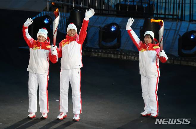 [베이징(중국)=뉴시스] 홍효식 기자 = 4일 오후 중국 베이징국립경기장에서 열린 2022 베이징 동계올림픽 개막식에서 최종 성화 주자인 디니걸 이라무장과 자오자원이 성화대로 향하고 있다. 2022.02.04. yesphoto@newsis.com