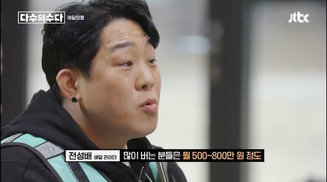 배달 라이더 전성배는 "저는 하루에 8시간 정도 일하고 400만 원 정도 가져간다. 다른 라이더에 비해 수입이 많지 않다. 많이 버시는 분들은 500만 원에서 800만 원까지 번다. 실제로 국민 부업이라고 불릴 정도로 많은 분들이 일하시고 계신다. 코로나 이후에 많이 하고 전업이 아니더라도 인센티브가 높은 점심, 저녁 피크 시간에 잠깐 알바하시는 분들도 굉장히 늘었다"고 현재 상황을 언급했다.